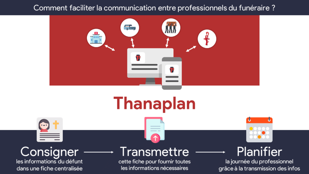 Médecin, transporteur, pompes funèbres, thanatopracteur, mairies… Beaucoup d’acteurs entrent en jeu lorsqu’un décès survient. Thanaplan permet à chacun de centraliser toutes les informations relatives aux défunts afin qu’elles soient communiquées facilement et rapidement auprès des professionnels concernés.