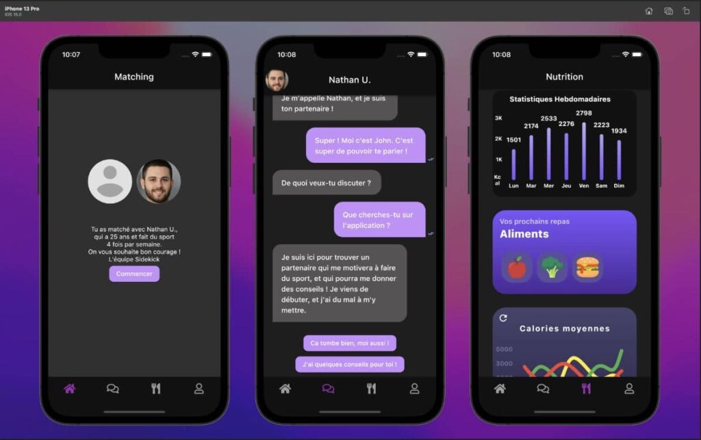 Sidekick est une application mobile qui permet de rencontrer son partenaire sportif afin de se tirer mutuellement vers le haut et atteindre des objectifs communs sur le plan physique ou nutritionnel. L’application propose des exercices et entraînements, un suivi des apports nutritifs et des dépenses énergétiques, des recettes, le tout pouvant être partagé avec son partenaire. Pour progresser, l’utilisateur pourra aussi profiter des conseils de coachs diplômés à travers un abonnement.