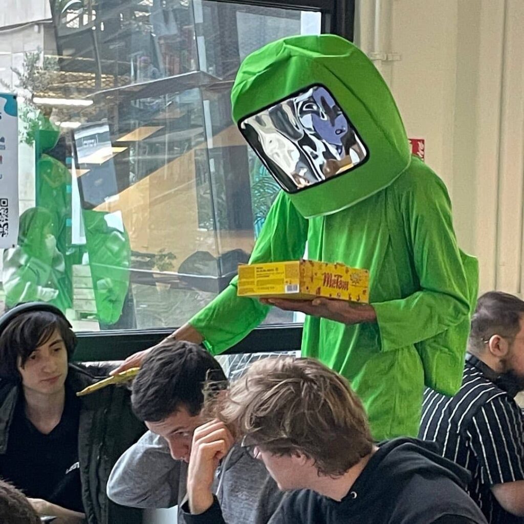 Sur le campus de Paris, de petits hommes verts du BDE Ravens distribuent chaque matin des douceurs aux étudiants pour leur donner du courage.