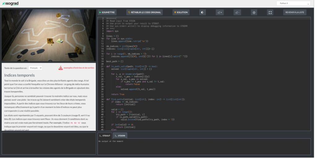 Chaque exercice contenait une histoire pour contextualiser le problème (indice temporels, opération discrétion, espionnage), ainsi qu’un exemple d’entrée et de sortie. « En entrée, on avait des données (liste de nombre), il fallait traiter ces données et les renvoyer sous forme de code. » Pendant chaque exercice, les participants avaient toute une série de test automatisé à passer et des exemples leur permettaient de les aiguiller pour avancer sur l’exercice.